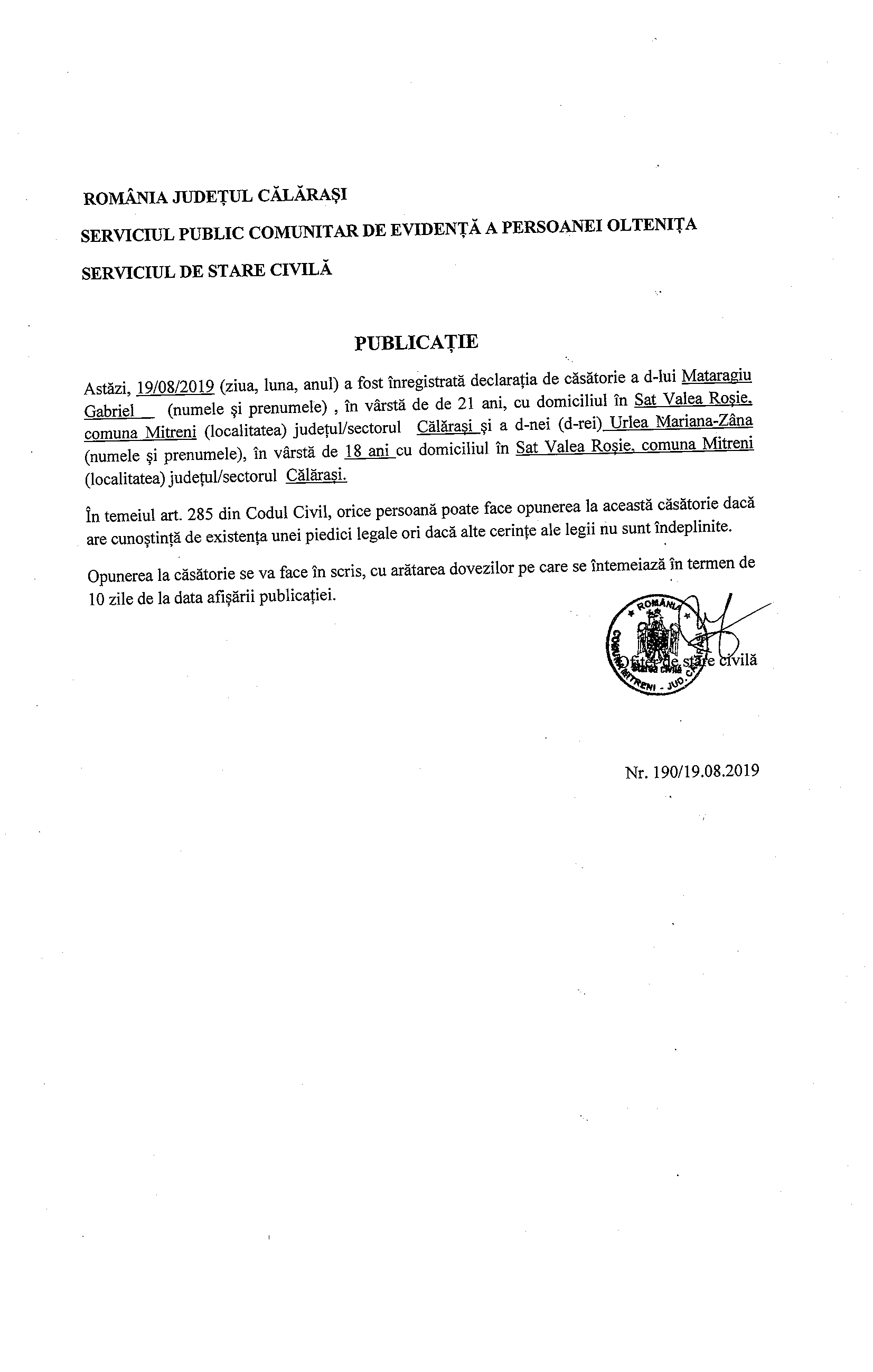 2019.08.19-Publicatie casatorie Mataragiu Gabriel si Urlea Mariana Zana