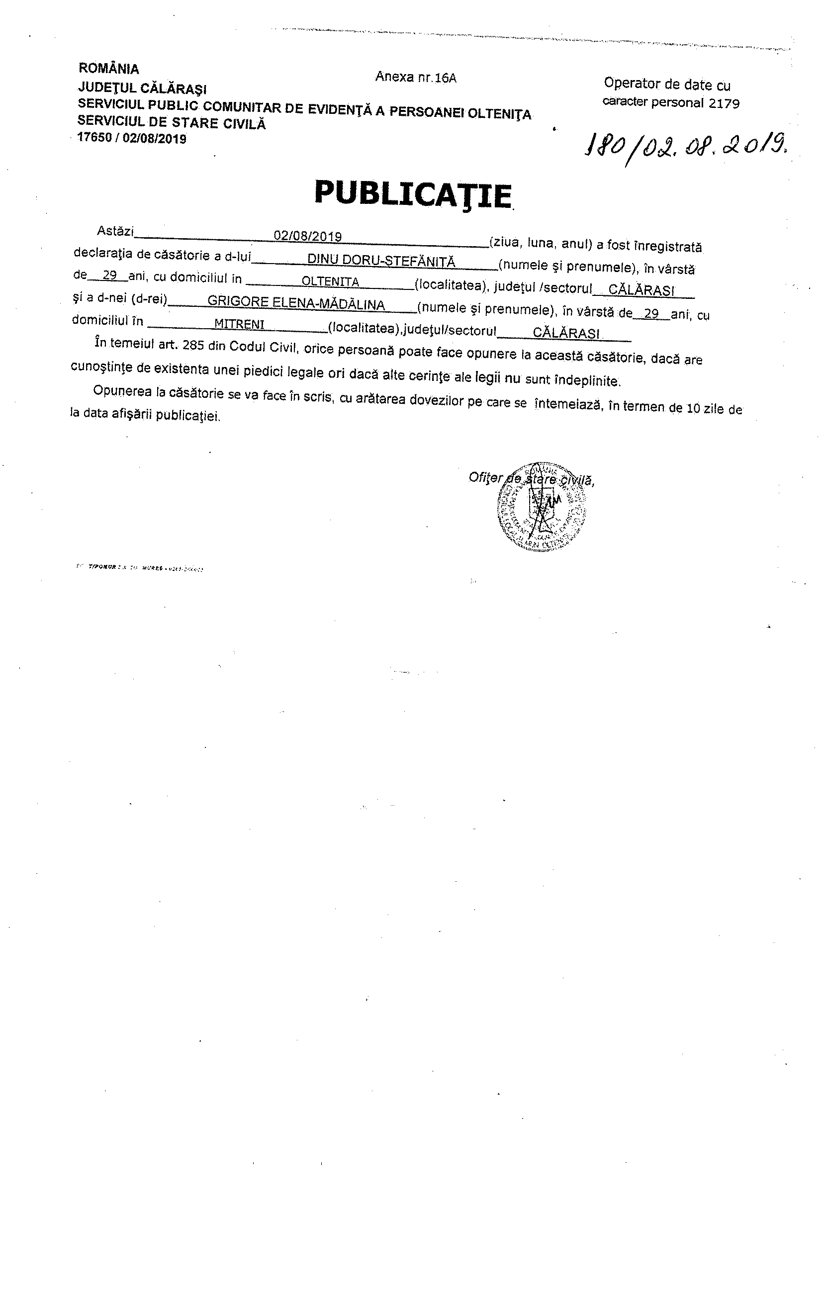 2019.08.02-Publicatie casatorie DINU Doru-Stefanita- GRIGORE Elena-Madalina